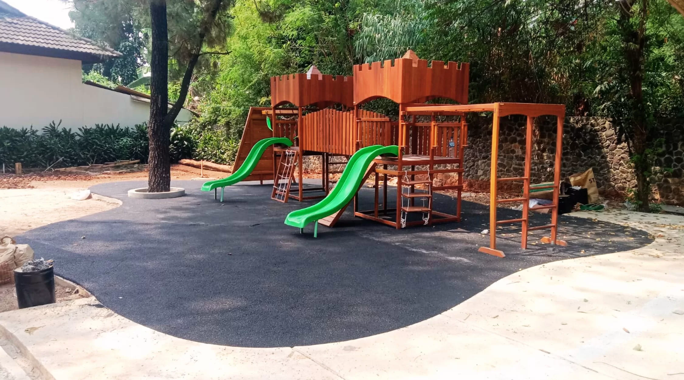 Playground dengan konsep natural memanfaatkan unsur alam seperti kayu, batu, dan tanaman untuk menciptakan area bermain yang menyatu dengan lingkungan. Jenis playground ini sangat cocok untuk destinasi wisata alam atau eco park.